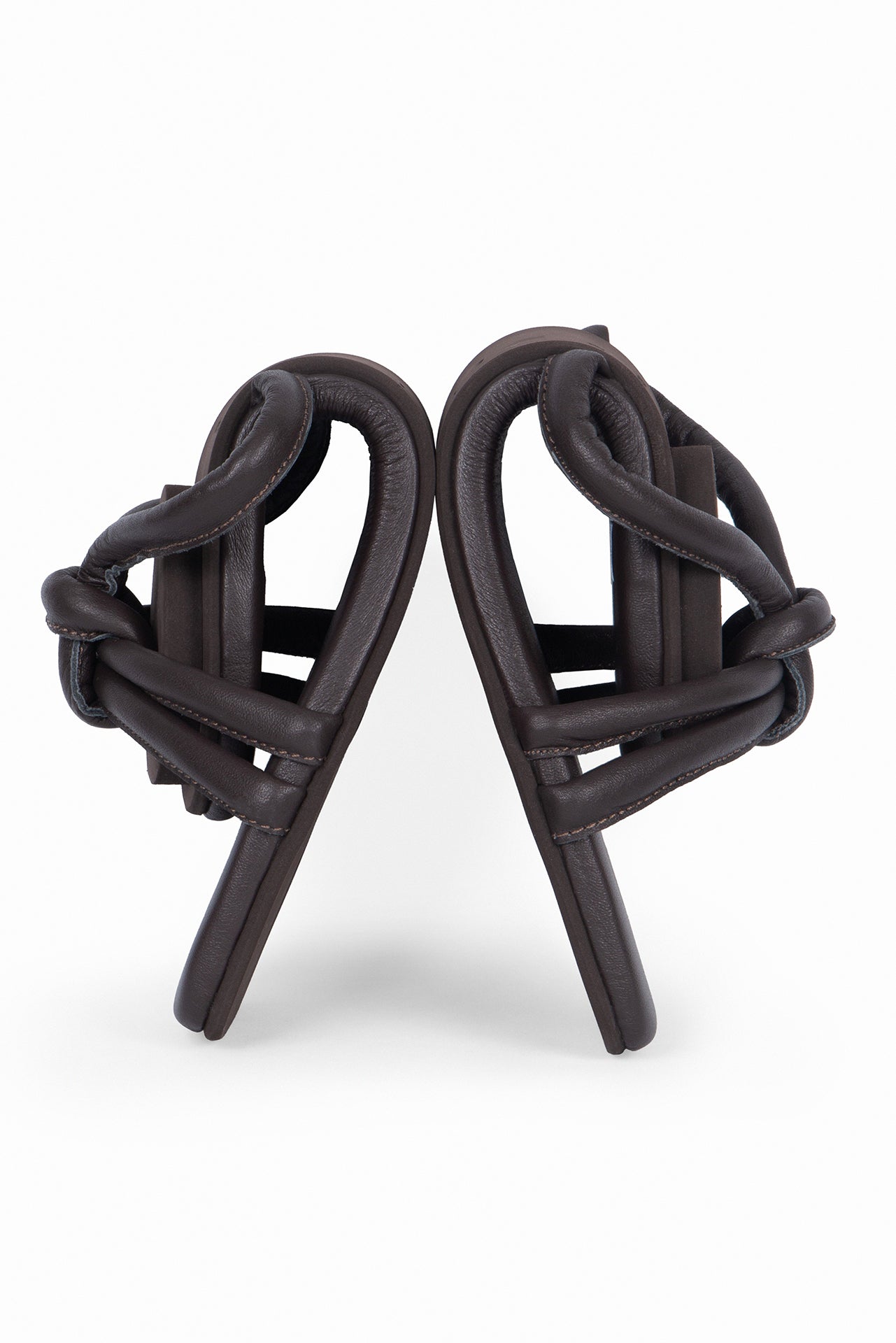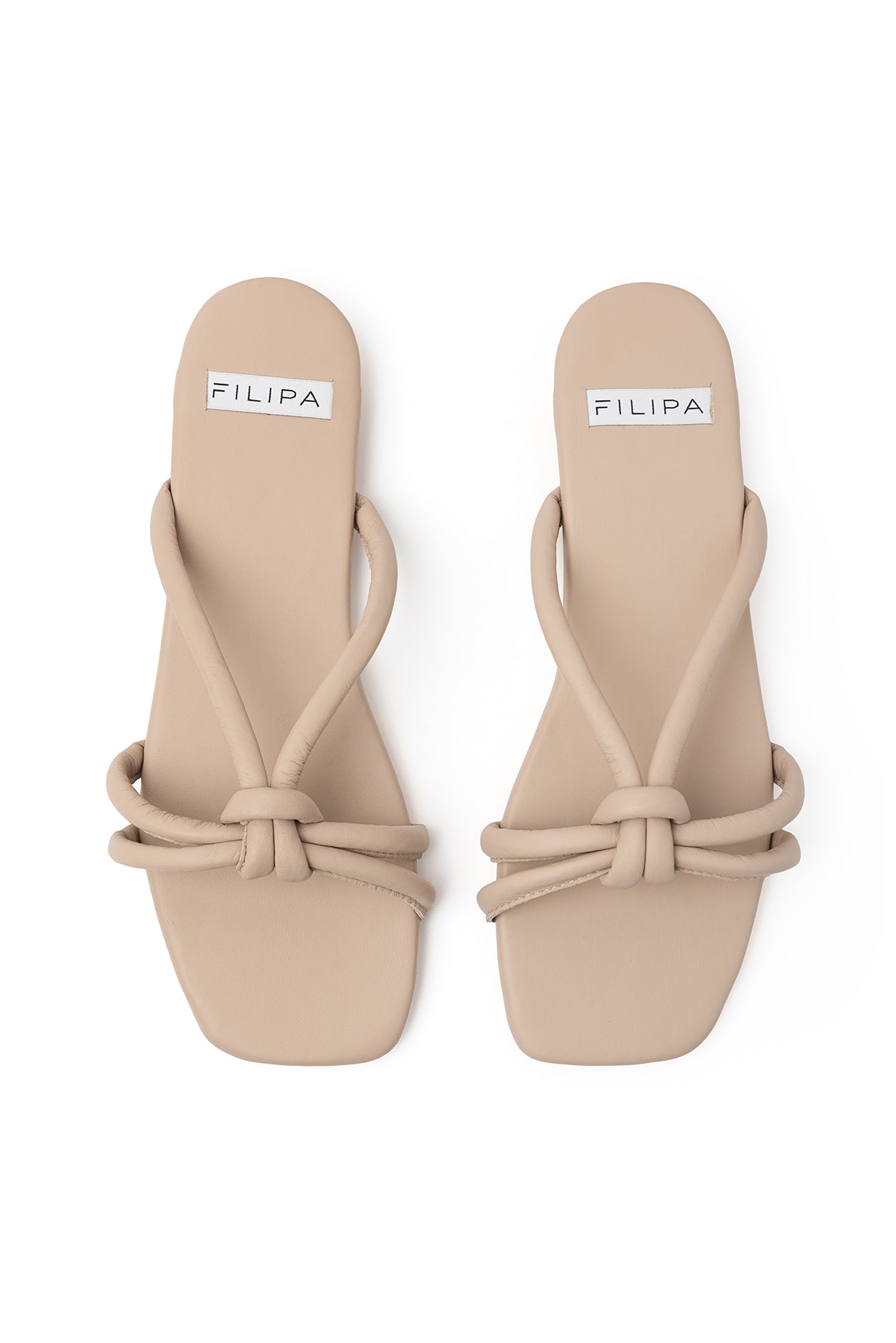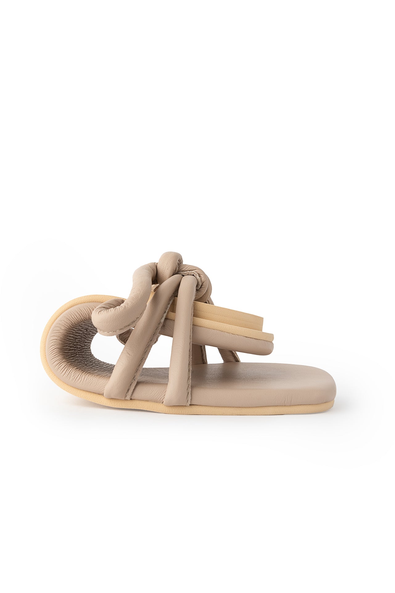 Zapato tipo sandalia plana de piel. Detalle de nudo en las tiras. Hechas a mano en cuero nappa de primera calidad extra suave. Tienen suela de goma flexible y son zapatos ultra livianos.
