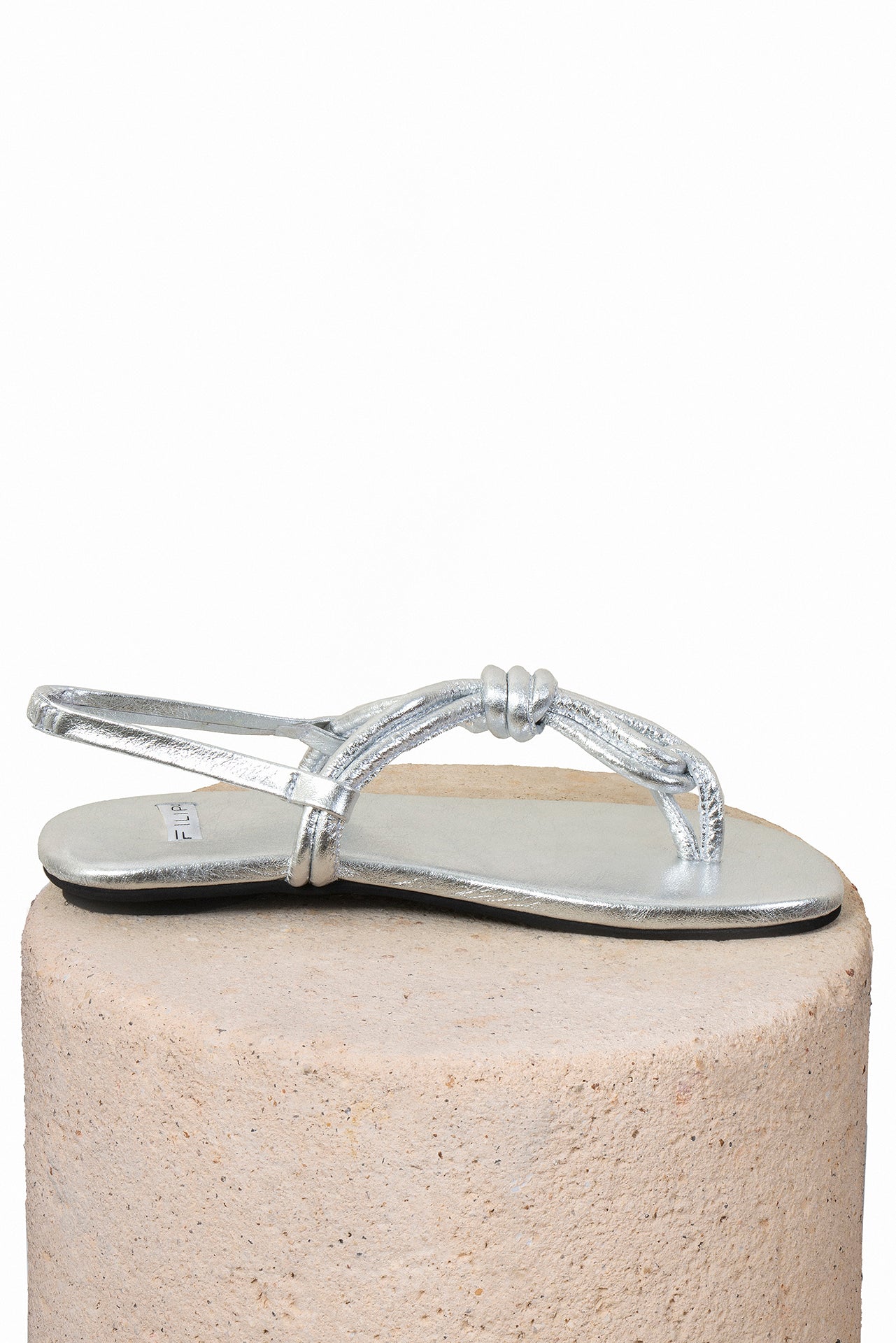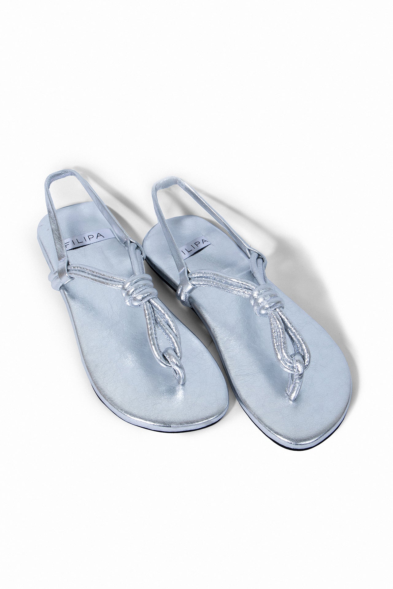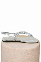 Sandalia plana en cuero metalizado con un diseño minimalista y moderno. Sus tiras delgadas y el nudo frontal le dan un toque especial sin esfuerzo. Tiene resorte en el talón para mayor comodidad y mejor ajuste al caminar. Es liviana, versátil y fácil de combinar, perfecta para acompañarte en días de verano y looks relajados pero cool.