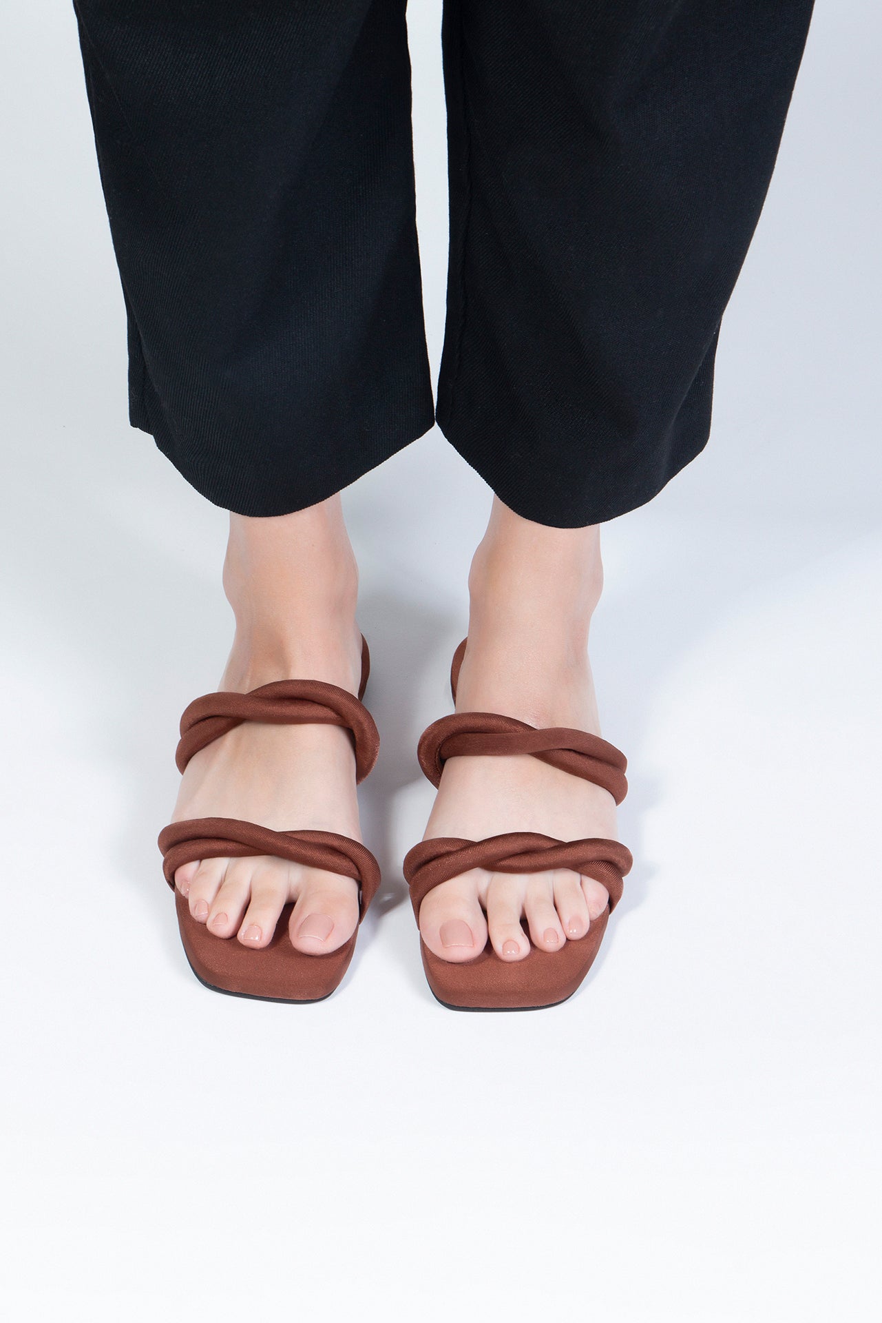 Sandalia plana con tiras entorchadas acolchadas en tela. Acabada en punta cuadrada. Tienen suela de goma flexible y son zapatos ultra livianos.