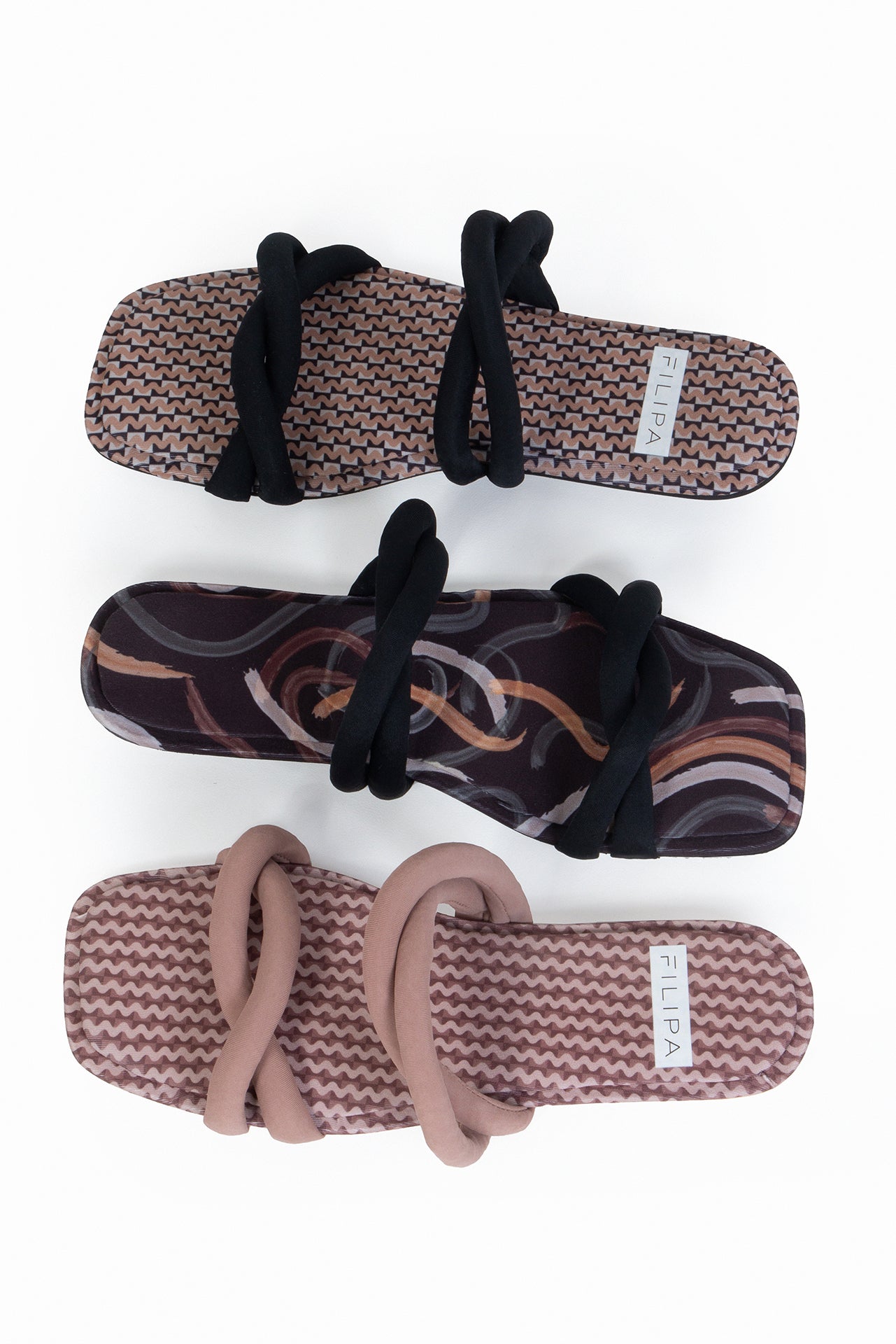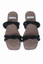Sandalia plana con tiras entorchadas acolchadas en tela. Acabada en punta cuadrada. Tienen suela de goma flexible y son zapatos ultra livianos.