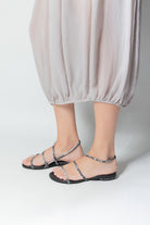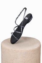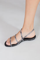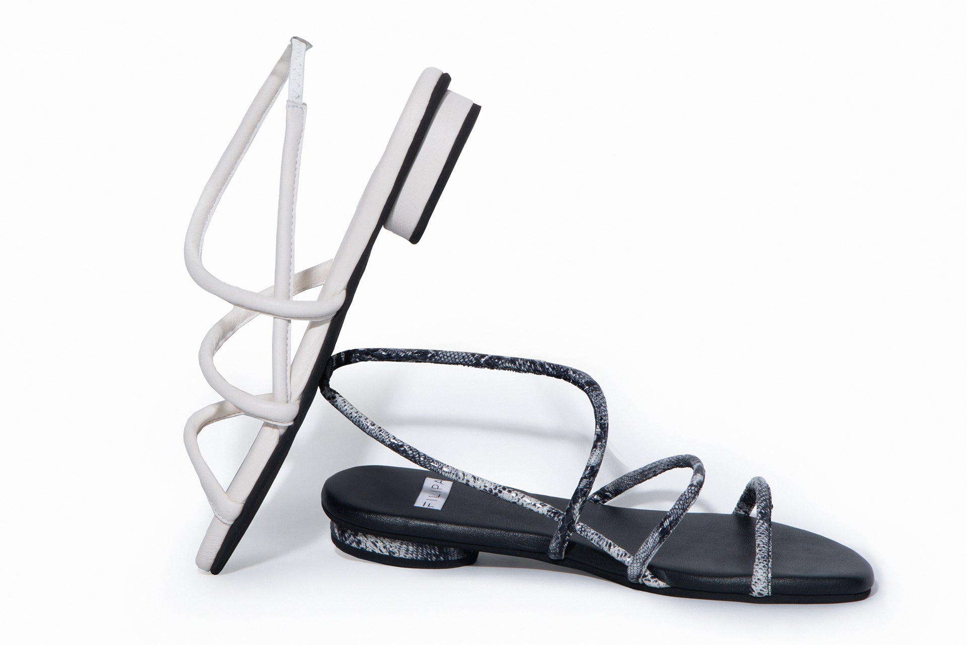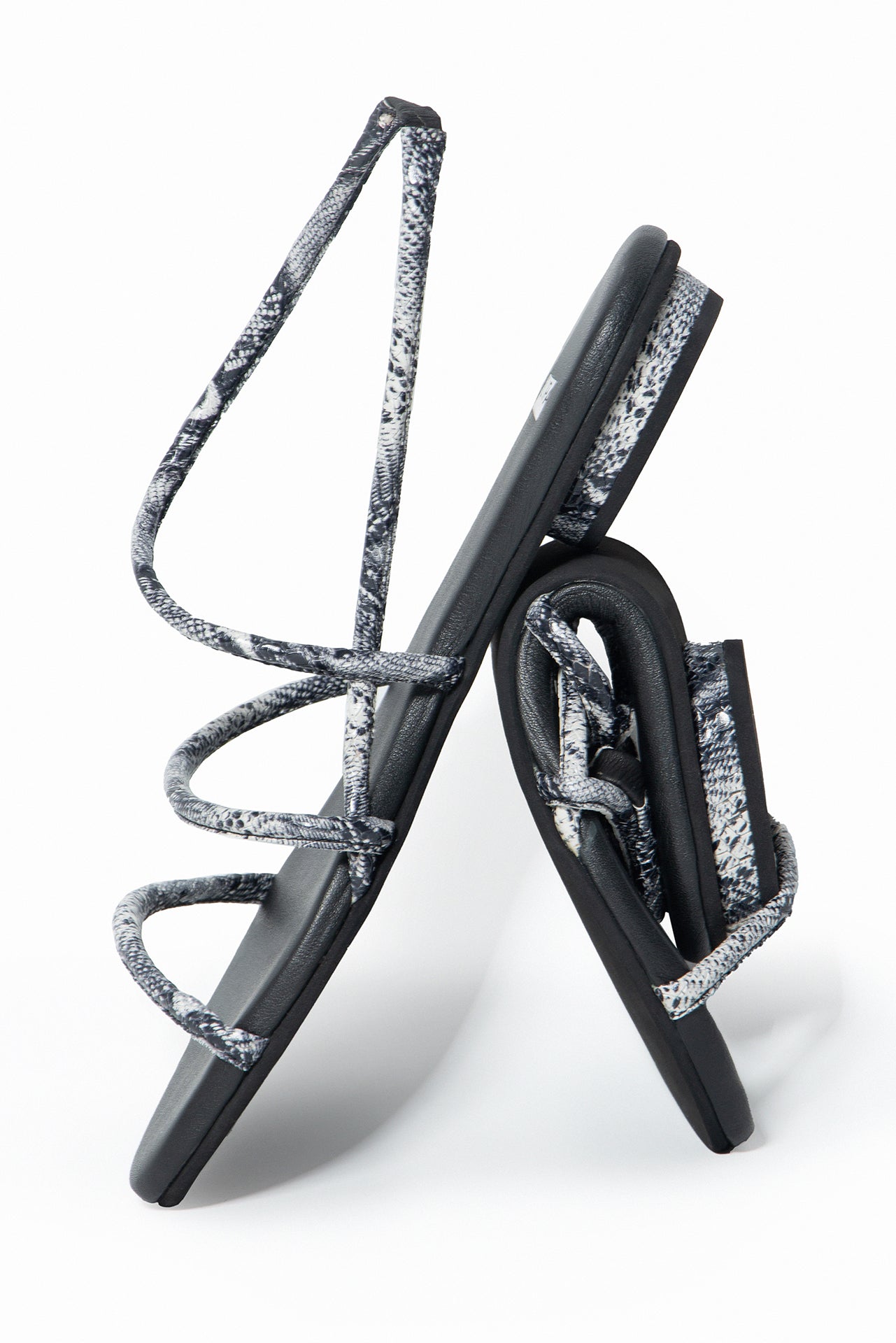 Diseño minimalista y elegante. Su estructura ligera con tiras delgadas se ajusta sutilmente al pie, brindando una apariencia femenina y sofisticada. Elaborada en cuero con textura pitón y plantilla acolchada que brinda confort durante todo el día.