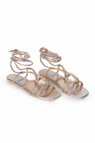 Elaborada en cuero napa suave, esta sandalia en color nude abraza el pie con un tejido delicado que combina estilo artesanal y sofisticación. Sus tiras largas se ajustan alrededor del tobillo o pantorrilla, permitiéndote jugar con diferentes formas de amarre según tu estilo y ocasión.